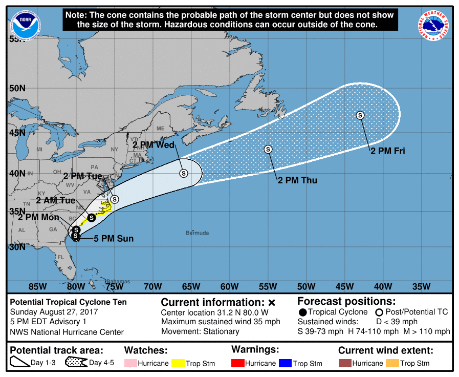 NHC has initiated advisories on Potential Tropical Cyclone 10, located off the SE U.S. coast. Forecasted to become TS Irma and affect SC & NC. A Tropical Storm Watch is in effect from South Santee River, South Carolina, to Duck, North Carolina.