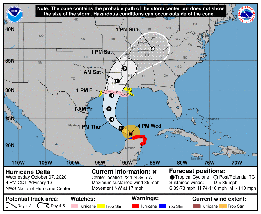 Here’s a look at the official NHC forecast calling for a steady N/NE bend in Delta’s track over the next couple days before landfall occurs Friday afternoon. It should be noted that while we’re pretty confident about where the storm will make landfall, there’s a bit more confusion about when exactly it will make landfall Friday afternoon, Friday night, or Saturday morning. Either way, plan on having all your preparations complete on Thursday.