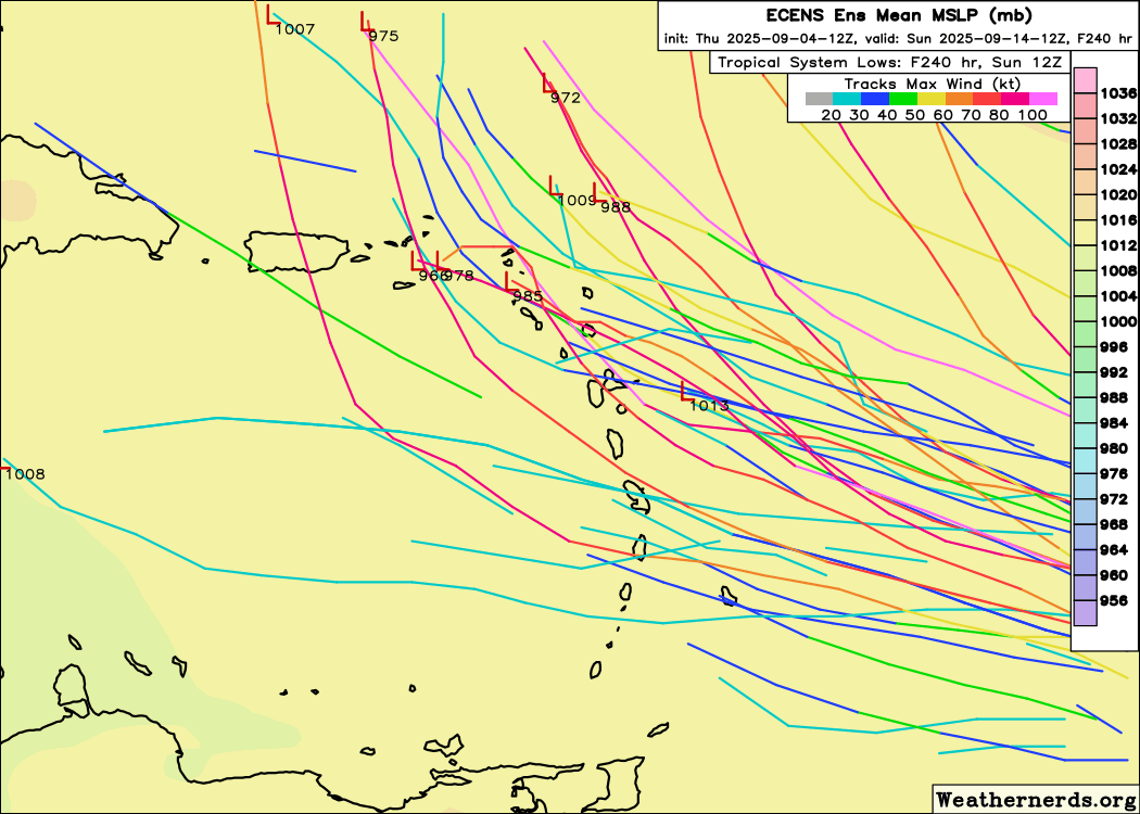 Here’s the latest European Ensembles and their westerly trend pointing right at the Lesser Antilles mid next week. Still lots of time for a new trend to emerge. Image valid 9/10/25 06Z. Lets keep watching…